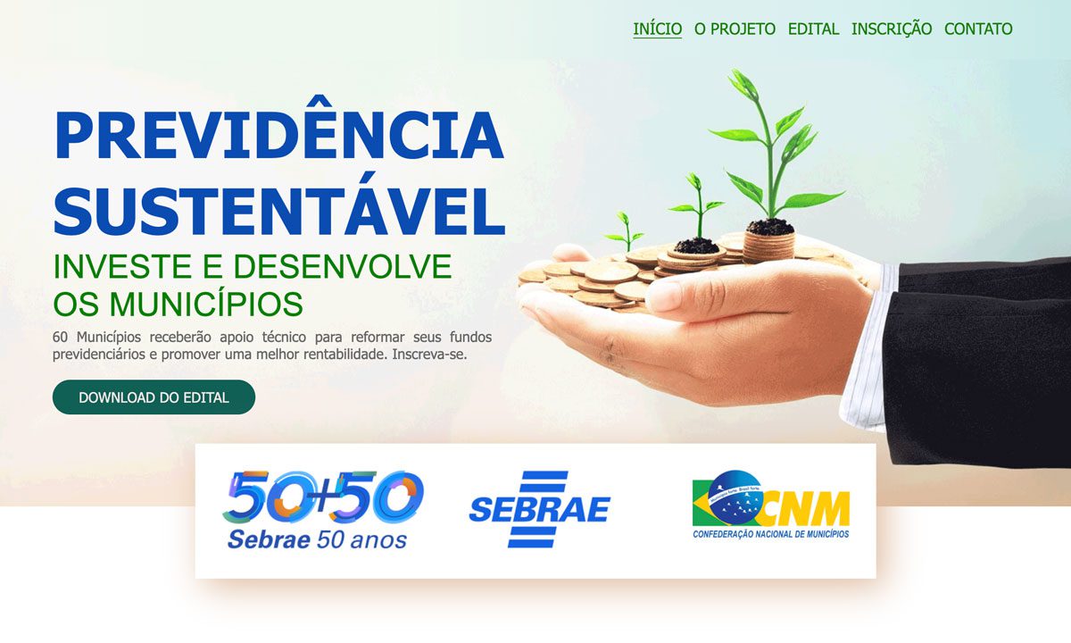 A Confederação Nacional de Municípios (CNM) e o Serviço Brasileiro de Apoio às Micro e Pequenas Empresas (Sebrae) abrem nesta segunda-feira, 9 de janeiro, edital para que os Municípios possam participar do processo de seleção para as Ações 1 e 2 do Projeto Previdência Sustentável: Investe e Desenvolve os Municípios. O edital vai selecionar 60 Municípios para participar do projeto piloto. Para isso, as administrações municipais precisam atender aos requisitos e critérios definidos. Confira aqui o edital completo e o hotsite do Projeto.