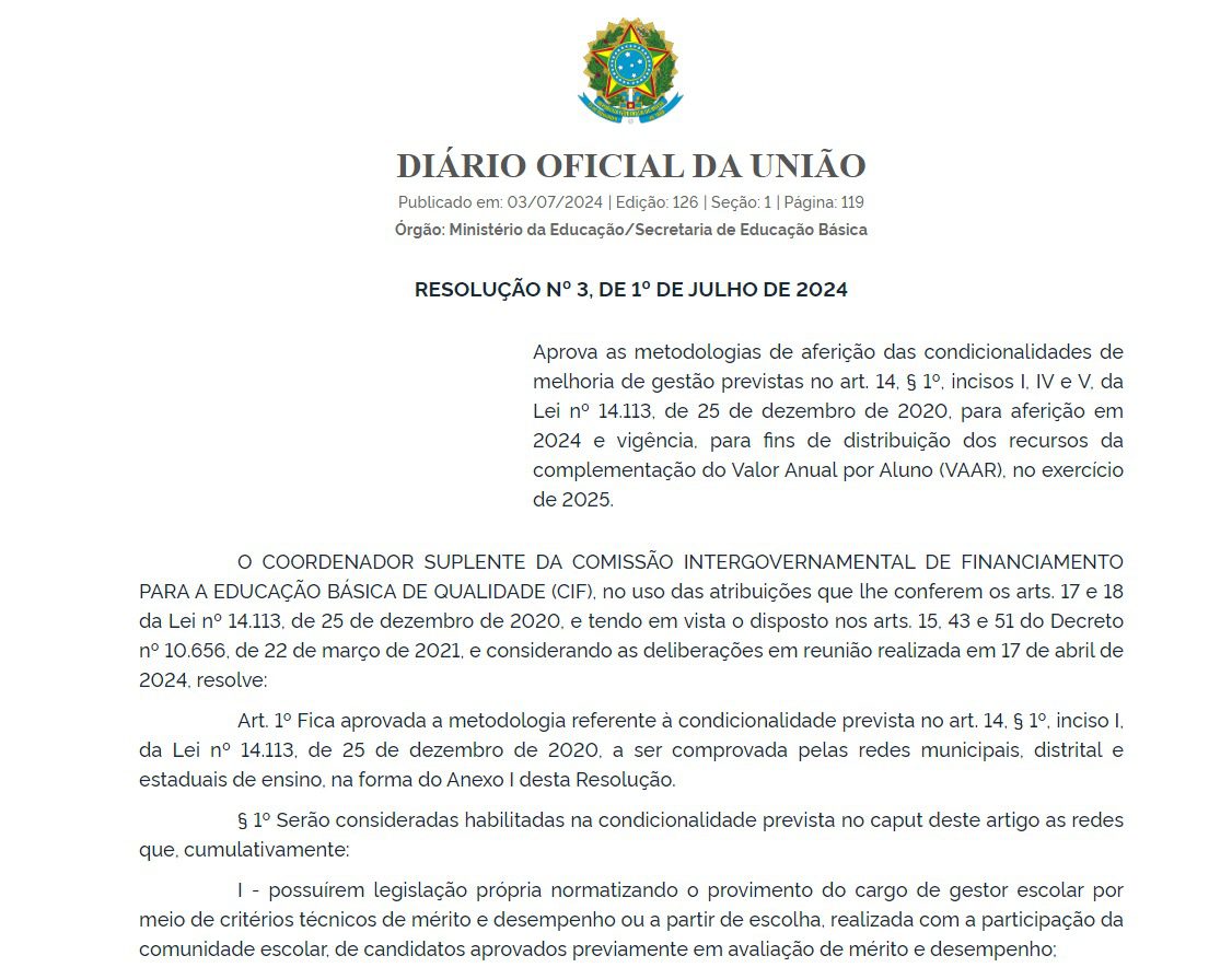 No Diário Oficial da União (DOU) de 03 de julho, foi publicada a Resolução 03/2024, da Secretaria de Educação Básica do Ministério da Educação (SEB/MEC), que aprova as metodologias de aferição das condicionalidades de melhoria de gestão em 2024 para distribuição dos recursos da complementação do Valor Anual por Aluno (VAAR) da União ao Fundo de Manutenção e Desenvolvimento da Educação Básica e de Valorização dos Profissionais da Educação (Fundeb) no exercício de 2025.