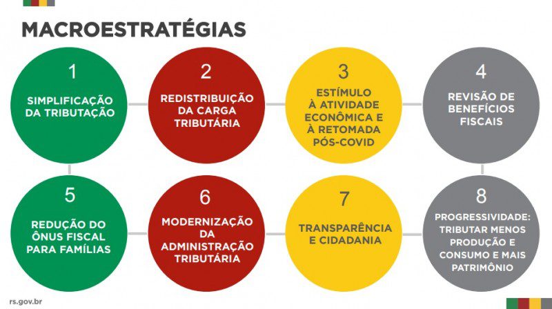 Baseado em três pilares – auxiliar o equilíbrio fiscal, tributar melhor e promover tributação mais justa –, o governo estabeleceu oito macroestratégias da Reforma Tributária RS: