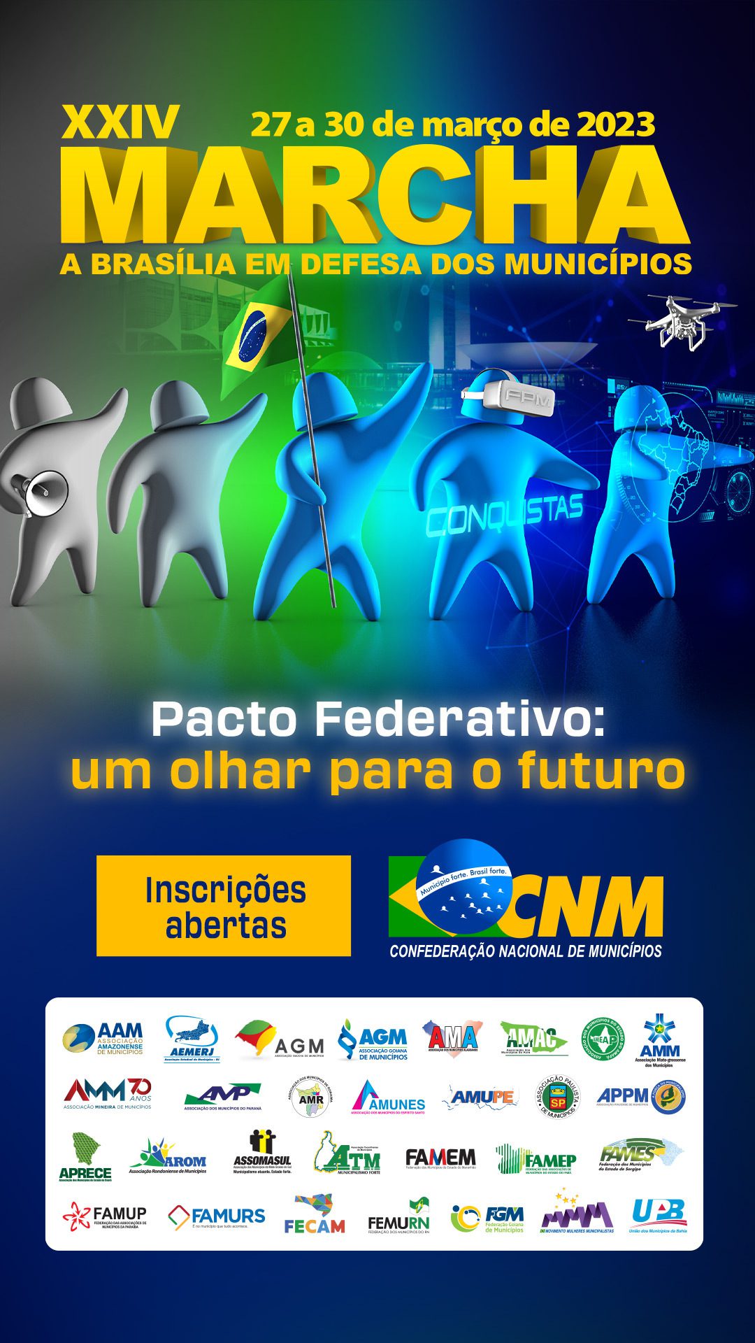 Palco de avanços, conquistas e forte mobilização de todo o movimento municipalista, a XXIV Marcha a Brasília em Defesa dos Municípios já tem tema definido e será Pacto Federativo: um olhar para o futuro. O evento acontece entre os dias 27 a 30 de março do próximo ano e o que torna esta edição ainda mais especial é que em 2023, a Confederação Nacional de Municípios (CNM) comemora um importante marco do movimento: os 25 anos de organização da Marcha a Brasília.