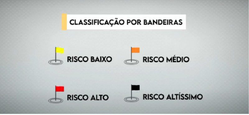 Conforme o resultado do cruzamento de dados divulgados de forma transparente, cada local recebe uma bandeira nas cores amarela (risco baixo), laranja (risco médio), vermelha (risco alto) ou preta (risco altíssimo).