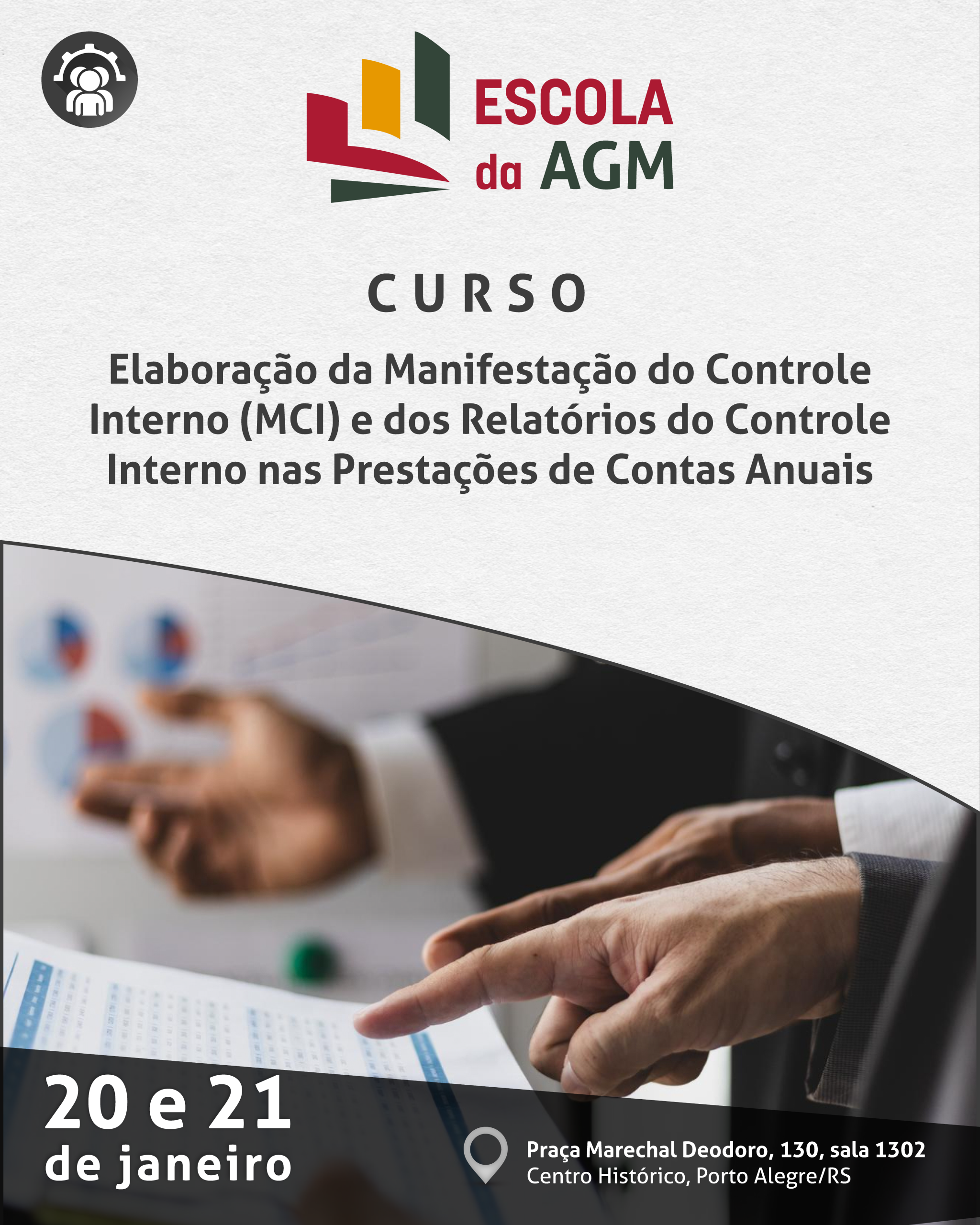 Nos dias 20 e 21 de janeiro, a Escola da AGM promove o curso “Elaboração da Manifestação do Controle Interno (MCI) e dos Relatórios do Controle Interno nas Prestações de Contas Anuais”, uma formação voltada a servidores e profissionais que atuam diretamente com auditoria, controle e prestação de contas no âmbito municipal.