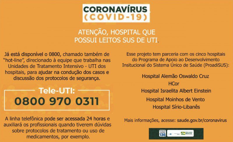 Hospitais do Rio Grande do Sul que têm leitos de Unidade de Tratamento Intensivo (UTI) destinados a pacientes de Covid-19 pelo Sistema Único de Saúde (SUS) contam com apoio do projeto de consultoria Tele-UTI Covid-19, do Ministério da Saúde. Por meio de uma linha telefônica disponível 24 horas por dia, médicos intensivistas podem fazer consultas com as equipes de consultores dos hospitais de excelência que fazem parte do projeto.