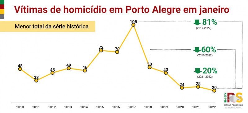 Crime considerado em todo o mundo como principal métrica da violência, os homicídios no Rio Grande do Sul mantiveram em janeiro a tendência de queda dos últimos anos. O número de vítimas passou de 152, no primeiro mês de 2021, para 135, uma retração de 11,2% e o menor total de 2006. Comparado ao pico da série histórica, em 2017, quando 348 pessoas foram assassinadas em janeiro no RS, a retração chega a 61,2%.