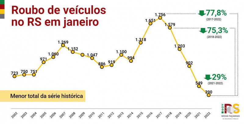 Nos roubos de veículos, o número de ocorrências em janeiro baixou de 549, no ano passado, para 390 neste ano, queda de 29%. Na comparação com 2018, último ano antes da implantação do RS Seguro, quando apenas no primeiro mês do ano 1.579 motoristas tiveram seus veículos levados por assaltantes no Estado, a marca atual representa retração de 75,3%.