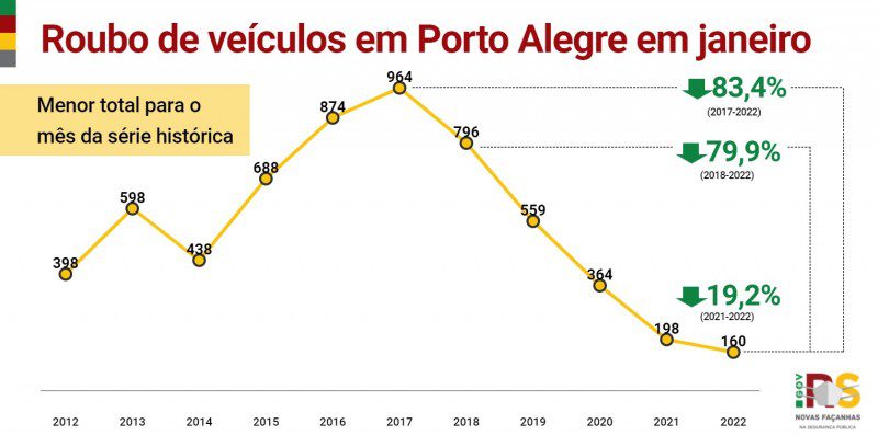 Só Porto Alegre, que integra o bloco de cidades priorizadas pelo programa, respondeu por 23% da queda de roubos de veículo verificada no Rio Grande do Sul. O número de ocorrências do tipo em janeiro na capital baixou de 198 no ano passado para 160 neste ano, retração de 19,2% e a menor marca da série histórica. Comparado com o último ano antes da atual gestão, quando houve 796 casos no mês em 2018, a diminuição chega a 79,9%.