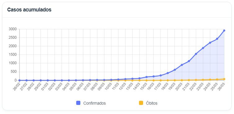 O total de casos confirmados saiu de 2.433 ontem para 2.915 casos. O resultado de hoje marcou um aumento de 54% nos casos em relação ao início da semana, quando foram contabilizadas 1.891 pessoas infectadas.